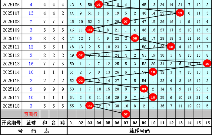 蓝球分析:上期开出蓝球号码03,分析蓝球最近10期奇偶个数发现,偶数较热,出现7枚,本期适当关注奇数蓝球;最近10期蓝球大小走势为:小-小-大-小-大-大-小-大-大-小,本期注意小 号蓝球,一码蓝球关注07。
