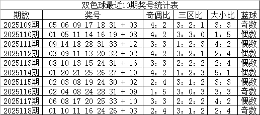双色球第2025118期开出奖号:01 10 11 16 24 26 + 03。其中红球号码三区比为3:1:2,奇偶比为2:4,大小比为2:4,蓝球开出奇数、小 号。